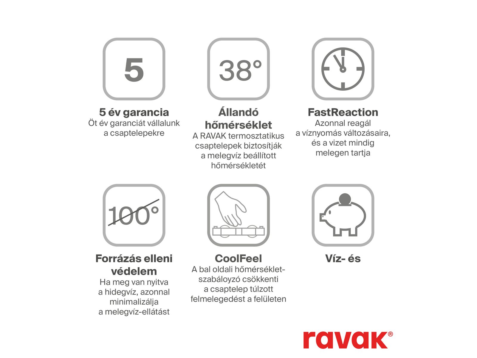 Víz- és energiatakarékos. A kívánt hőmérséklet automatikusan és gyorsan beállítható. A termosztáttal sokkal kevesebb a vízveszteség, mint a víz hőmérsékletének kézi szabályozása esetén.