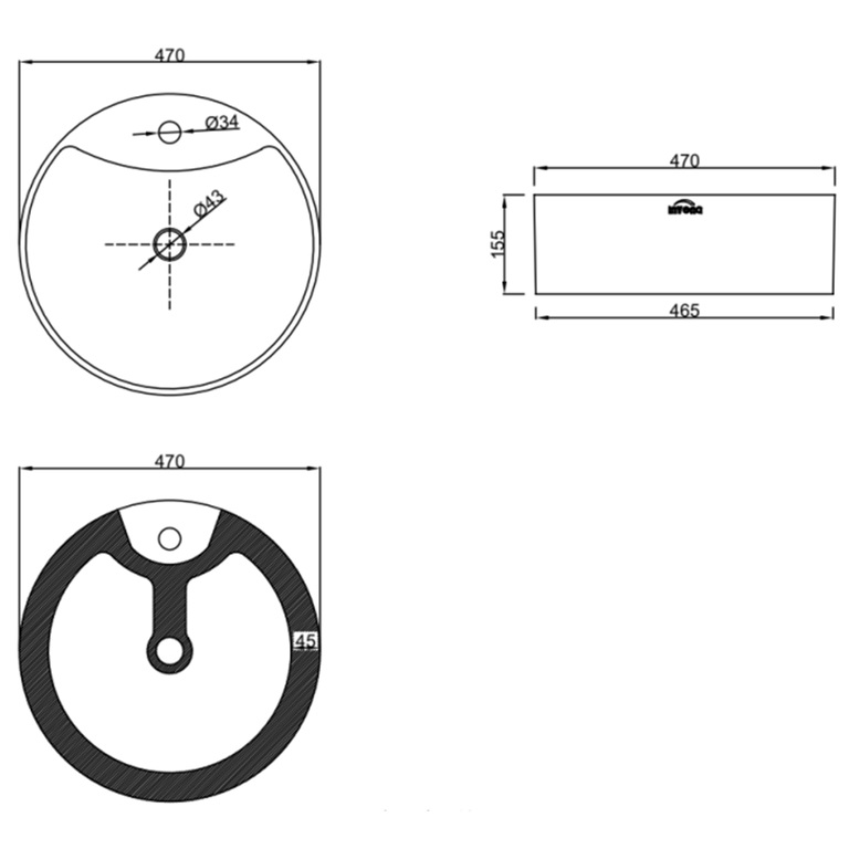 Invena Rondi pultra tehető 47 cm kerek mosdó, csaplyukkal