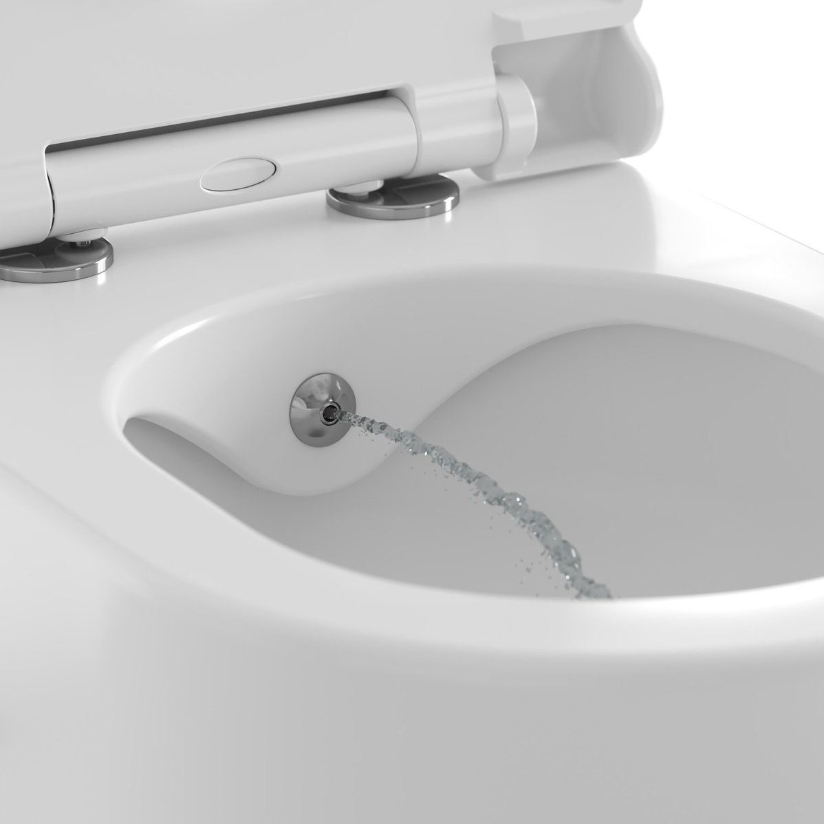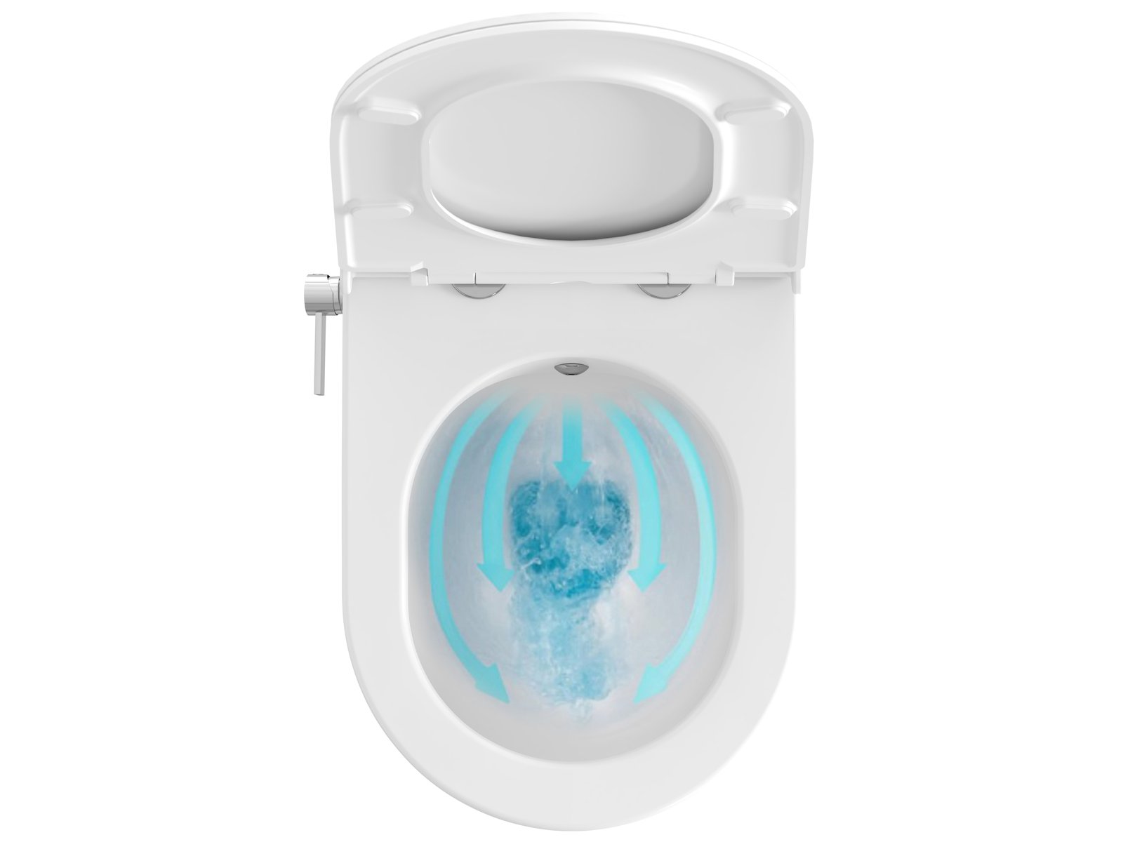 A WC-kagylóba beépített bidé fúvóka optimális vízsugár szöge állítható. A víz áramlási intenzitását és hőmérsékletét a WC jobb oldalán található keverőkar szabályozza. Nincs szükség elektromos csatlakozásra.
